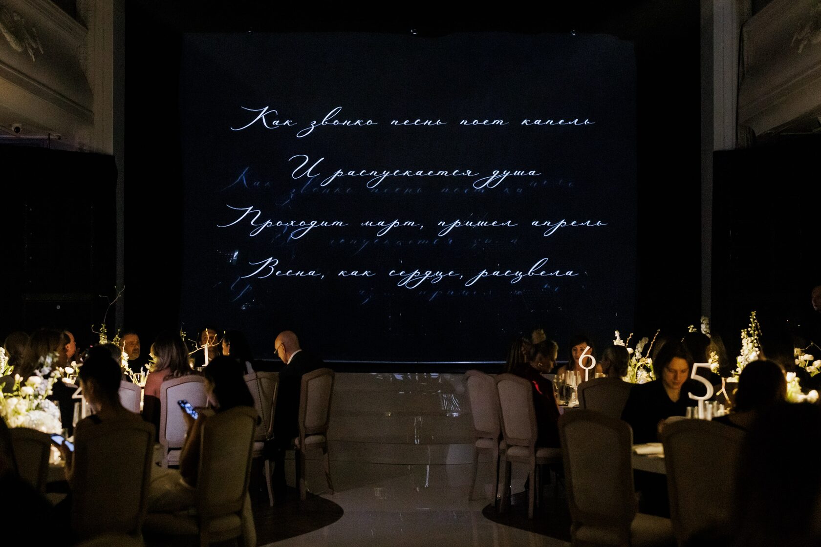 The musical journey opened with an overture performed by “The Hermitage” ensemble and “The Seasons” by P.I. Tchaikovsky. Next came Prima Ballerina and Honored Artist of the Russian Federation Ekaterina Pervushina and talented pianist Riad Mammadov. During the dinner guests also enjoyed poetry about spring interpreted by actor Konstantin Kryukov and actress Elena Dudina.